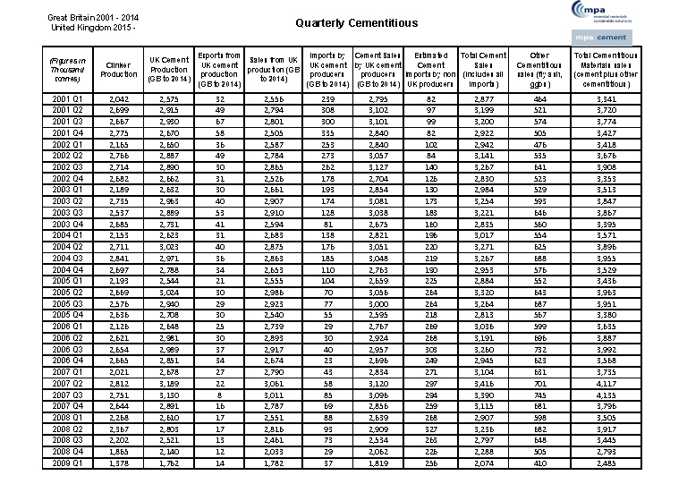 Statistics from 2001 to 2014 were supplied on a GB basis. From 2015 onwards MPA Cement industry statistics are on a UK basis.